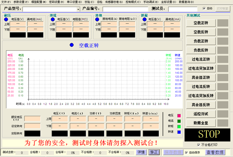 | 7 | 過電流正轉測試(過電流突加) | 過電流正轉測試:接著 PLC控制發(fā)出“open”,測試電機先運行在加載扭矩(設定),運行一段時間(設定)突然加載過電流扭矩(設定),采集電機轉速,進行記錄,維持一段時間(設定)后發(fā)送“stop”。 |